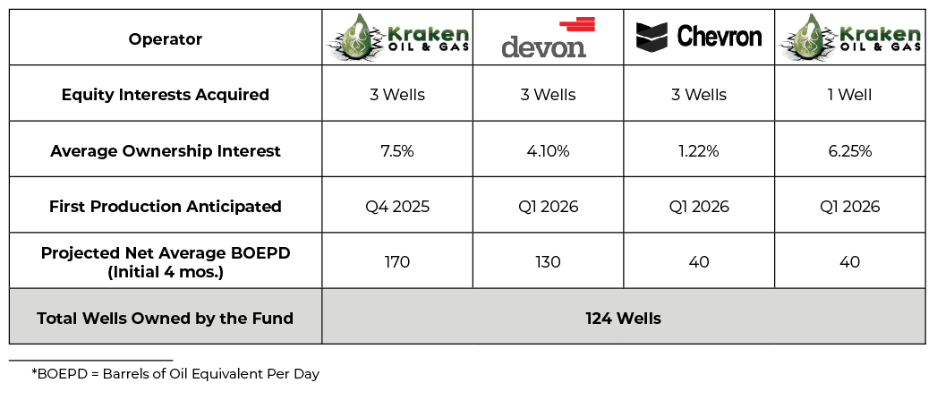 We are pleased to announce that WRP VII has completed four (4) additional acquisitions totaling ten (10) wells in the core of the Bakken Shale in North Dakota. These projects are operated by major public companies, including Chevron Corporation (NYSE: CVX) and Devon Energy Corporation (NYSE: DVN), with combined market capitalization of over $320 billion. In addition, Kraken Oil & Gas, a leading private equity-backed Bakken operator, is also included in these transactions. As of the date of this announcement, all ten wells were in stages of drilling or completion by the respective operator.